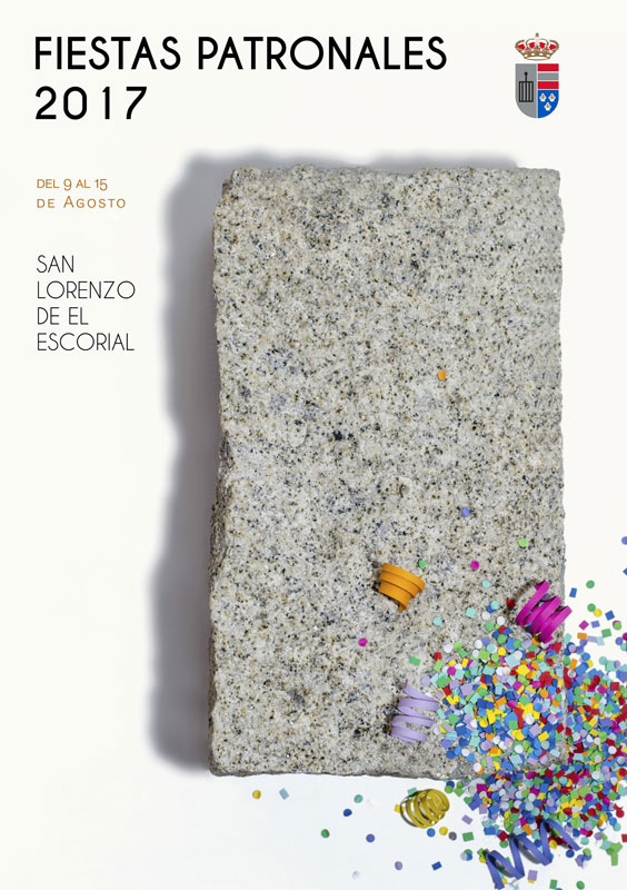 Toda esta larga introducción sirve para valorar el cartel de las Fiestas de San Lorenzo que por simple puede servir para cualquier pueblo de la Sierra donde el granito sea un elemento esencial en su paisaje o en su utilización una vez trabajado. Es cierto que en El Escorial los decorados serranos contienen esta piedra de cuarzo, feldespato y mica en cantidades inmensas. Pero colocar una piedra sin desbastar para anunciar la Fiestas de un Real Sitio como San Lorenzo, sin ninguna otra referencia del lugar, me parece que el jurado, en este caso, no ha estado acertado. Sinceramente no me ha gustado, pero ya se sabe que para gustos se hicieron los colores.